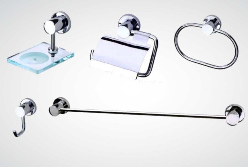 Este kit de acessórios para banheiro inclui uma saboneteira de parede com base transparente, um porta-papel higiênico com tampa frontal, um toalheiro de argola, um gancho simples e um toalheiro de barra reta, todos com fixação robusta e design coeso.