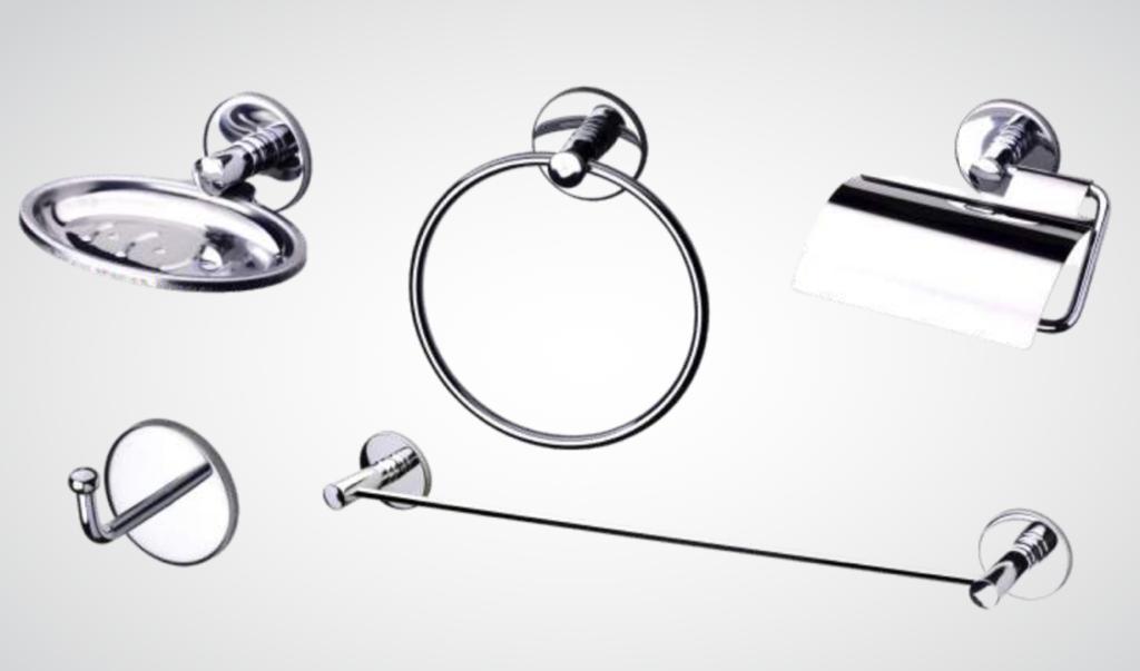 Componentes: Saboneteira, Anel Toalheiro, Suporte para Papel Higiênico, Gancho, Toalheiro em Barra