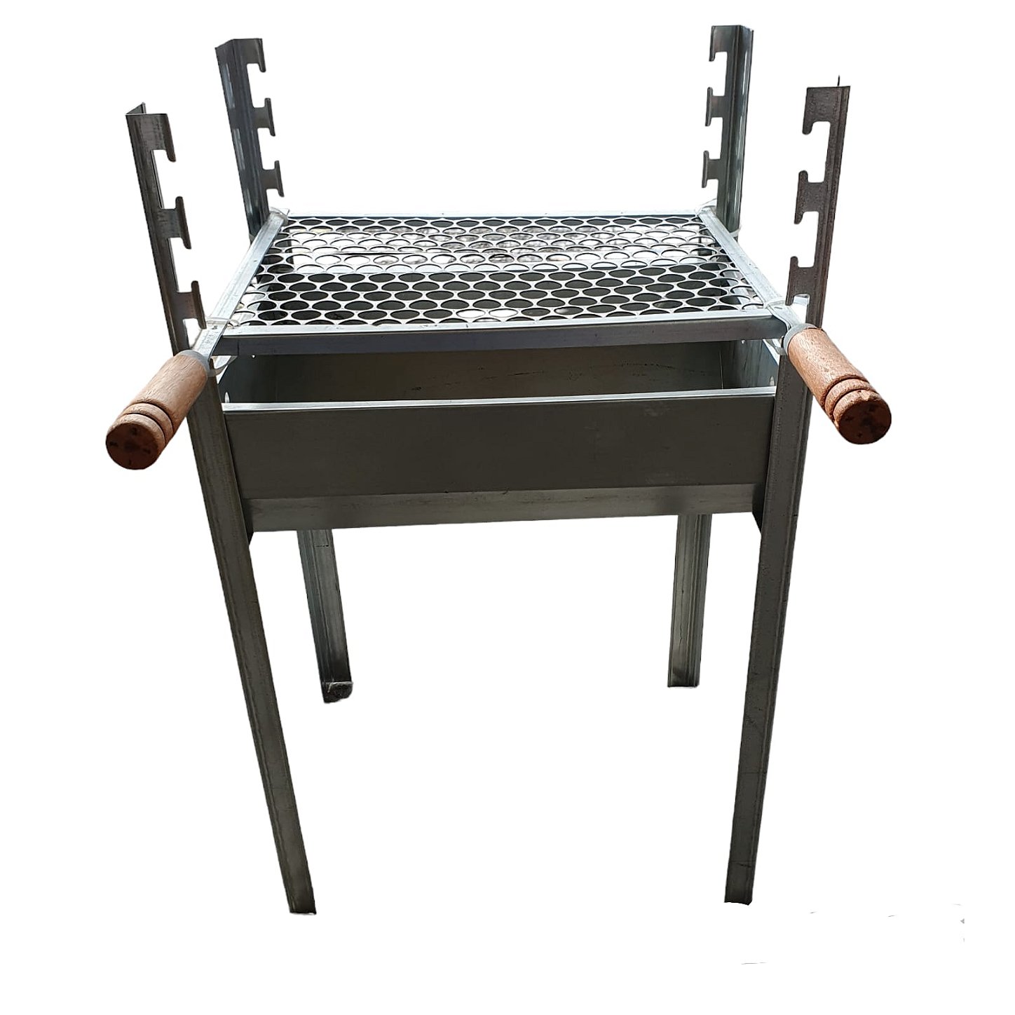 Desfrute de um churrasco perfeito com a Churrasqueira Beno Desmontável Média 1002, referência 771651, da renomada marca BENO METAIS CHURRASQ. Projetada para ser uma churrasqueira de chão robusta e funcional, sua estrutura retangular principal em tom metálico prateado ou cinza garante durabilidade e resistência. Acompanhada por quatro pernas metálicas estáveis, esta churrasqueira a carvão é ideal para diversos ambientes, desde o quintal de casa até acampamentos e encontros ao ar livre. Seu grande diferencial é a grelha retangular ajustável em diferentes alturas, com um padrão de furos hexagonais que otimiza o calor, permitindo o preparo ideal de carnes e legumes. As alças cilíndricas de madeira nas extremidades da grelha proporcionam segurança e conforto no manuseio, enquanto a bandeja removível de cinzas na cor metálica facilita a limpeza e manutenção. Uma solução completa para quem busca praticidade e qualidade em seus churrascos.