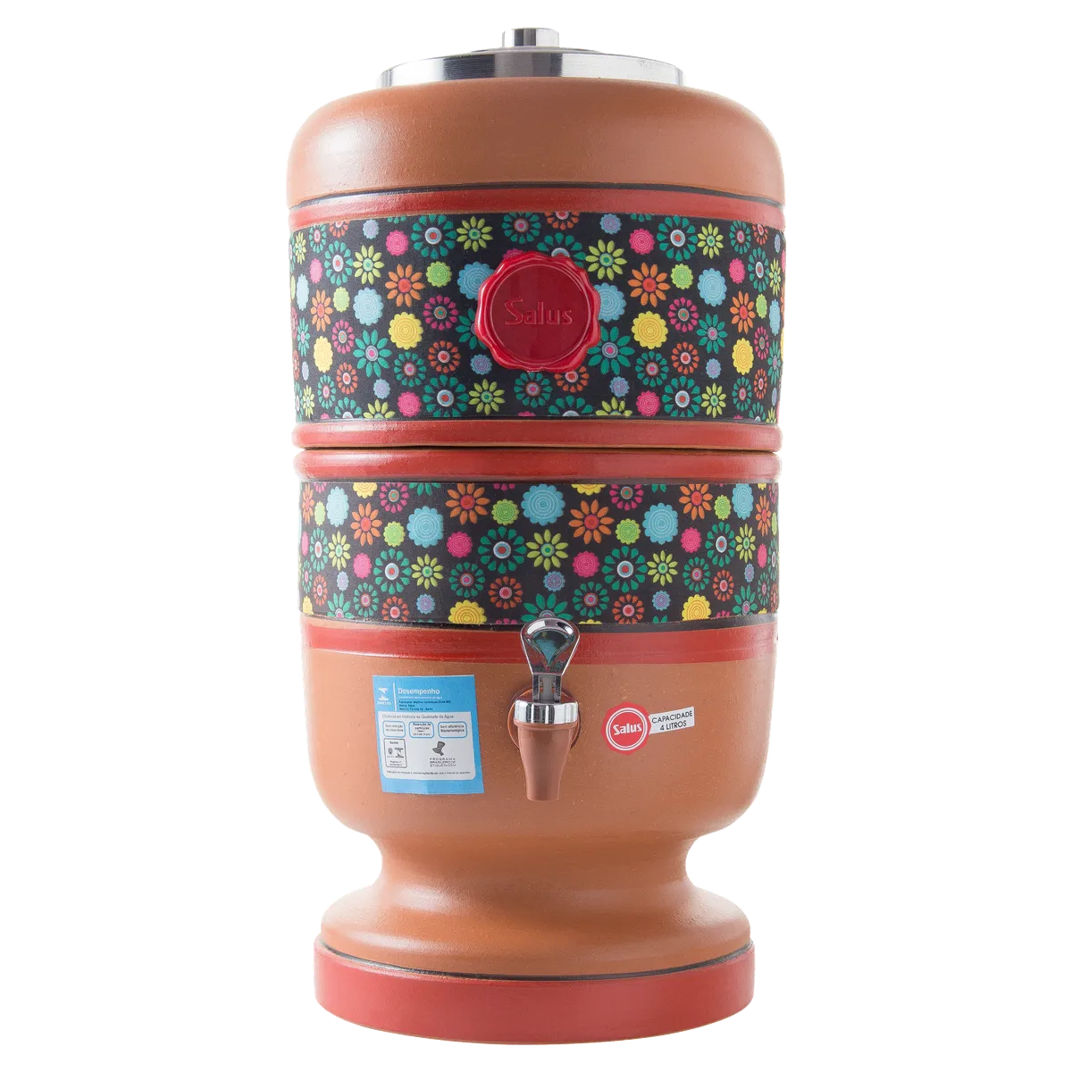 Filtro de barro com design inovador, com faixa decorativa confeccionada em tecido impermeável, tampa de alumínio e torneira cromada.